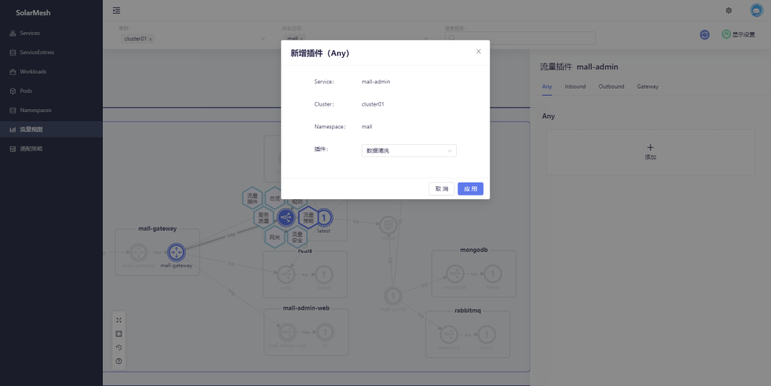 SolarMesh在 v1.10.2 版本中引入了流量插件的概念,将一些轻量级的业务封装成插件,在SolarMesh的界面上为应用流量在入站、出站时进行编码增强,达到对业务流量的切面编程(AOP Aspect Oriented Programming)能力。可以应用于对流量有业务诉求的使用场景,例如对敏感业务数据的过滤,在系统需要停机更新前下发更新通知,对特定核心接口的数据上报等。